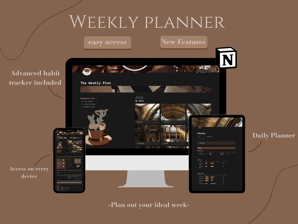 Notion Weekly planner, Dark academia palanner, Aesthetic Notion Planner, Notion template 2023, Habit tracker, Notion organizer